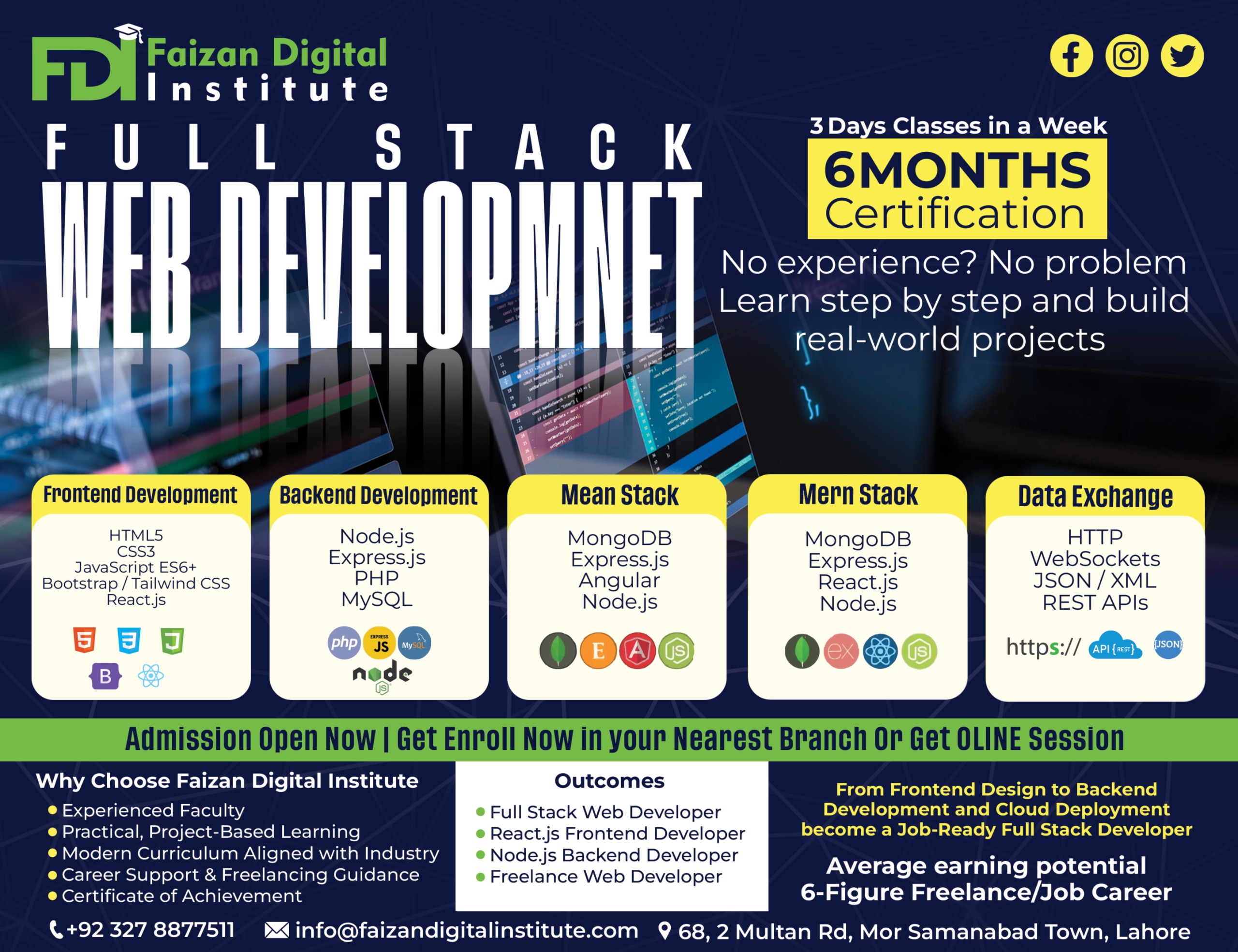 Our Full Stack Web Development course is designed for beginners and intermediate learners who want to master both frontend and backend development. By the end of this program, you’ll be job-ready with real-world projects in your portfolio.